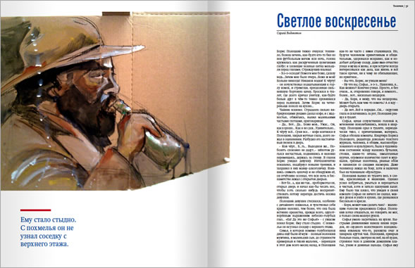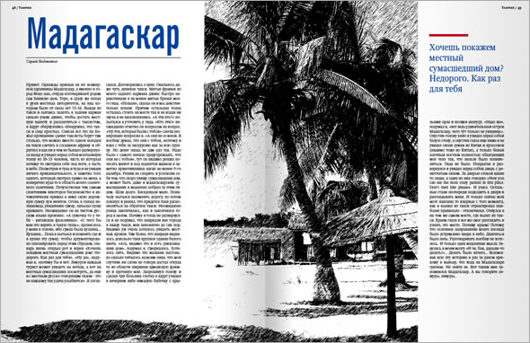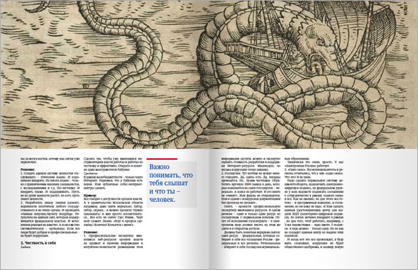 Решение: сетка журнала имеет под своей основой достаточно сложную структуру, что обеспечивает гибкость ее применения; крупные иллюстрации на две трети разворота; тщательный подбор шрифтов и взешенные типографические решения обеспечивают необходимый журналу ритм и стиль.