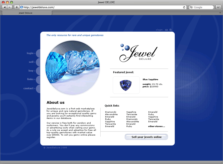 Jewel DELUXE – это сайт, посвященный онлайн продаже/покупке редких драгоценных камней. В дизайн студии Dot Seven был разработан дизайн сайта и произведено программирование всей необходимой функциональности - поиск и выбор драгоценных камней, безопасная сделка онлайн с использованием платежной системы.